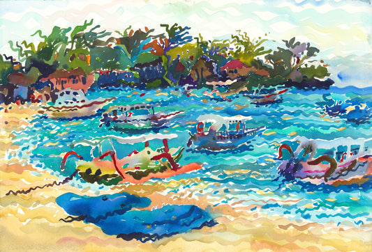 Boats in Kampie Village in Cambodia Original Watercolor by Tanbelia