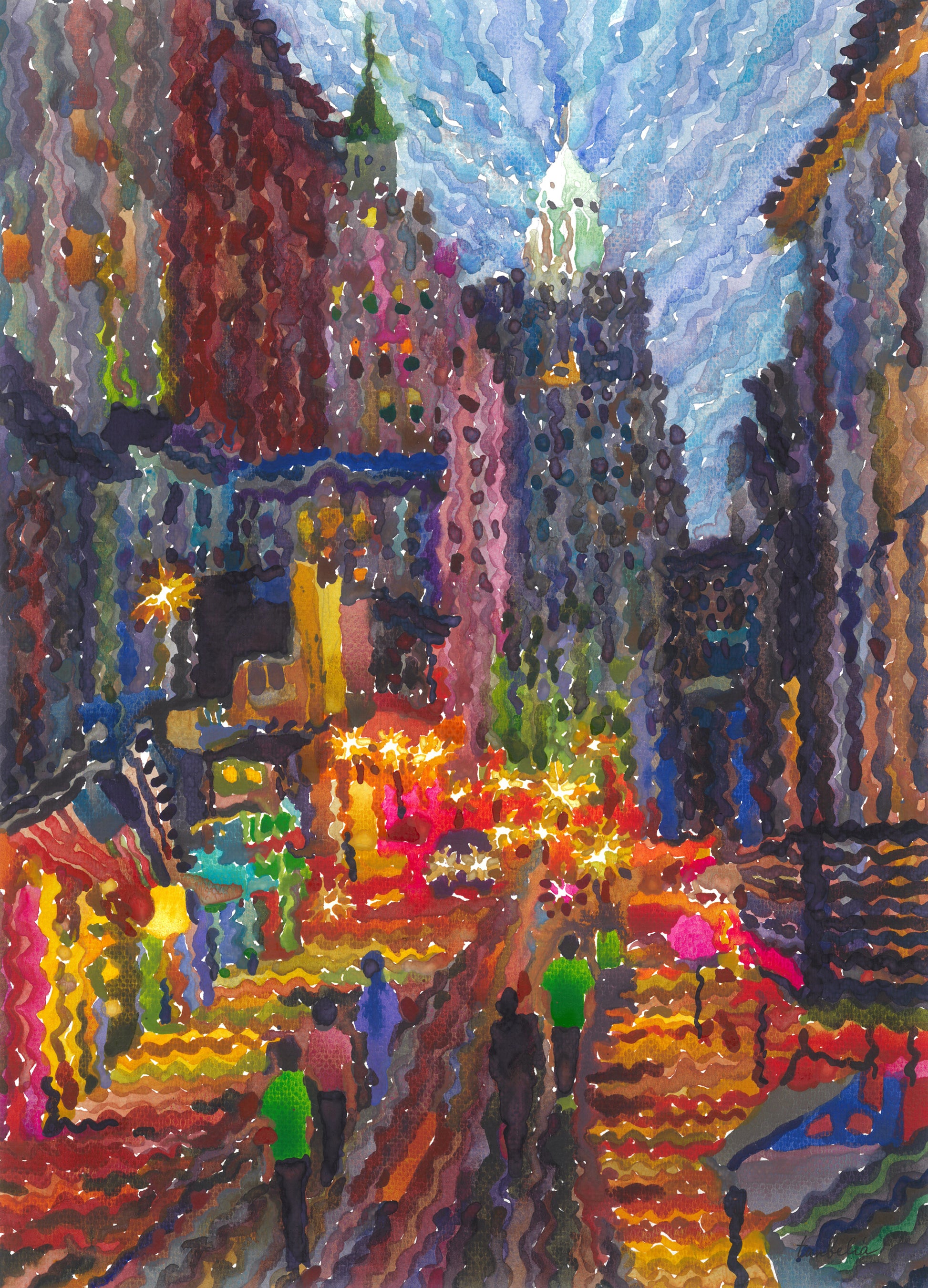 Materials: watercolor paints, watercolor paper, watercolor brush.